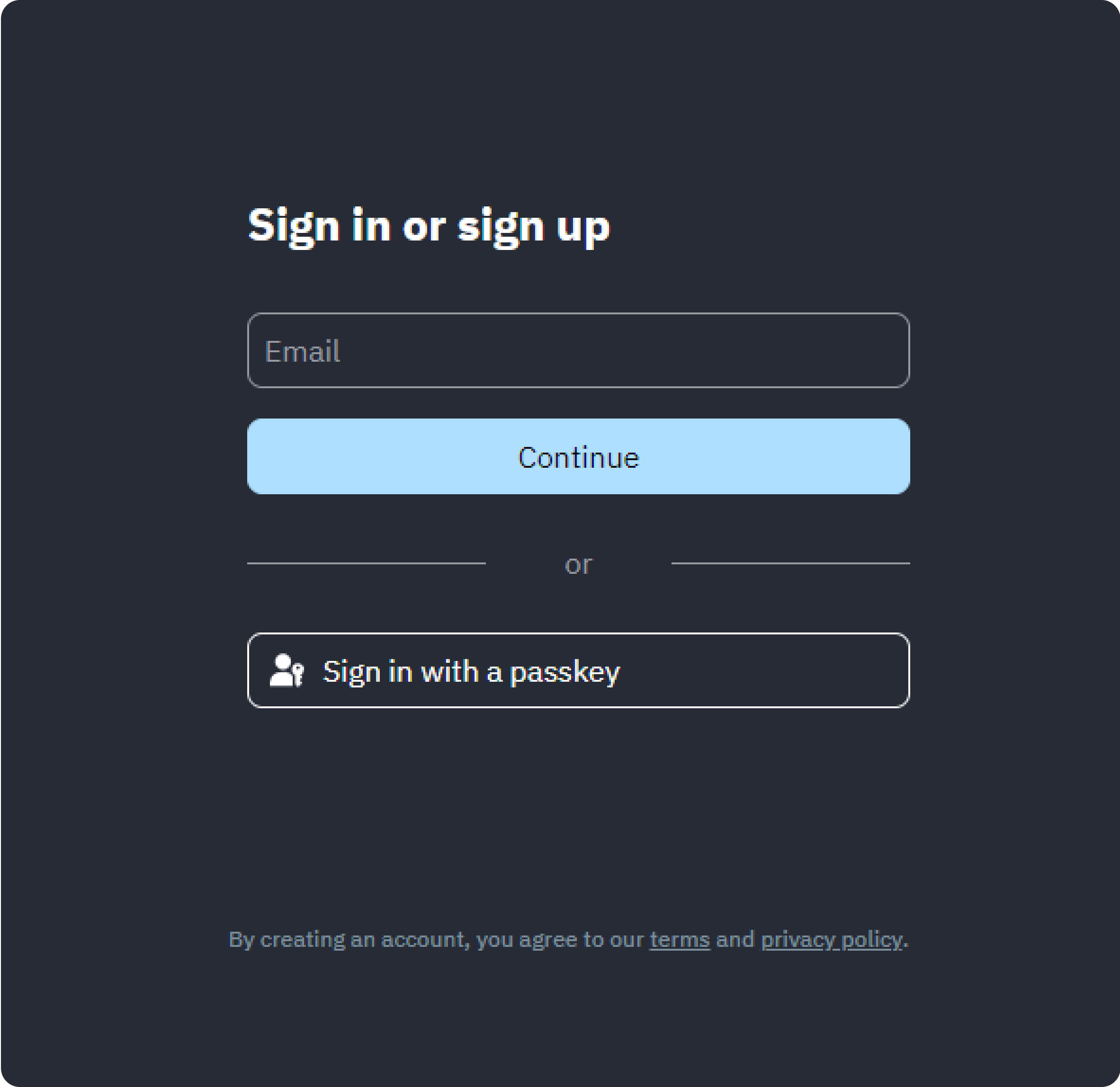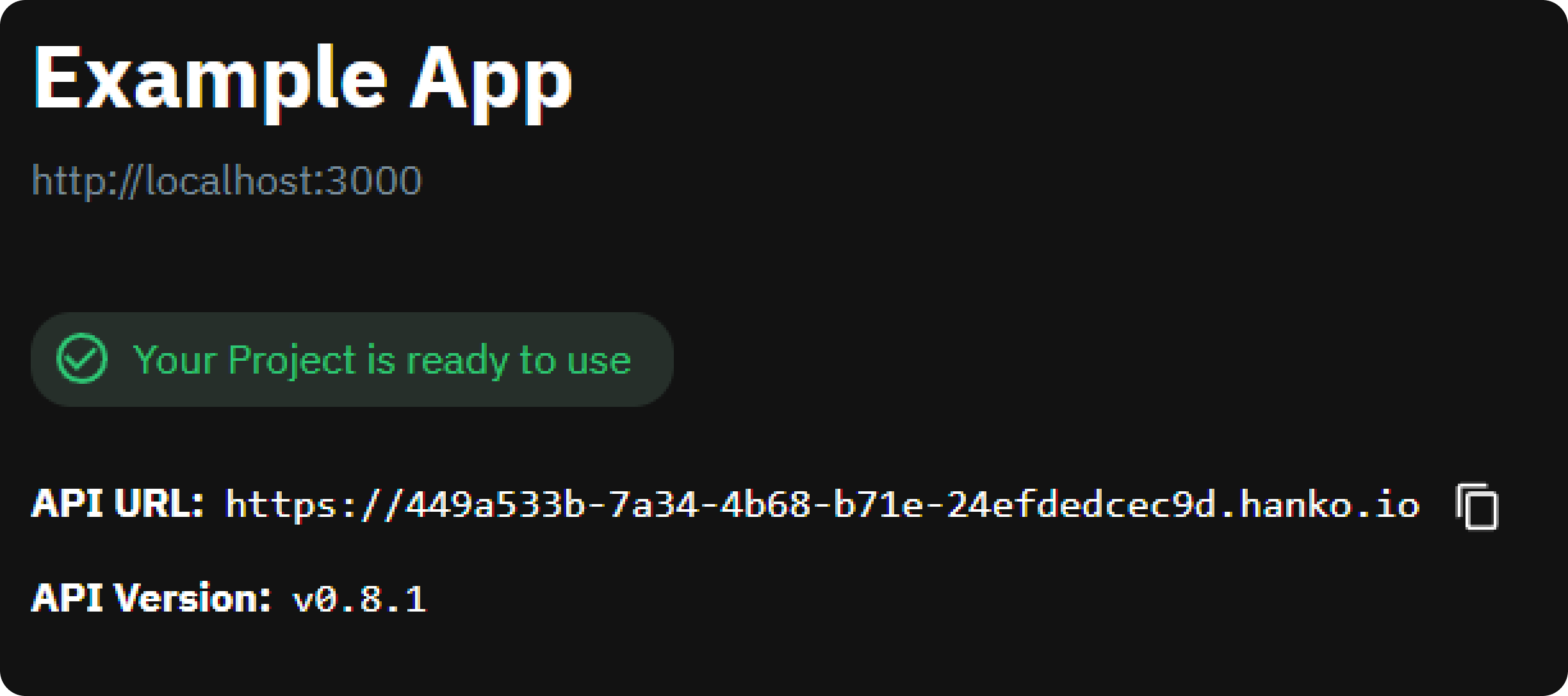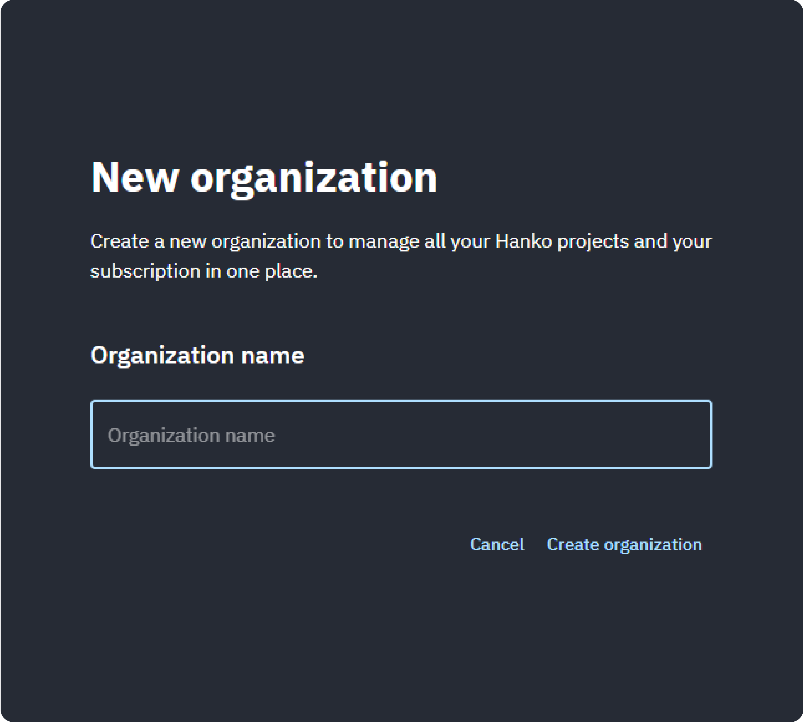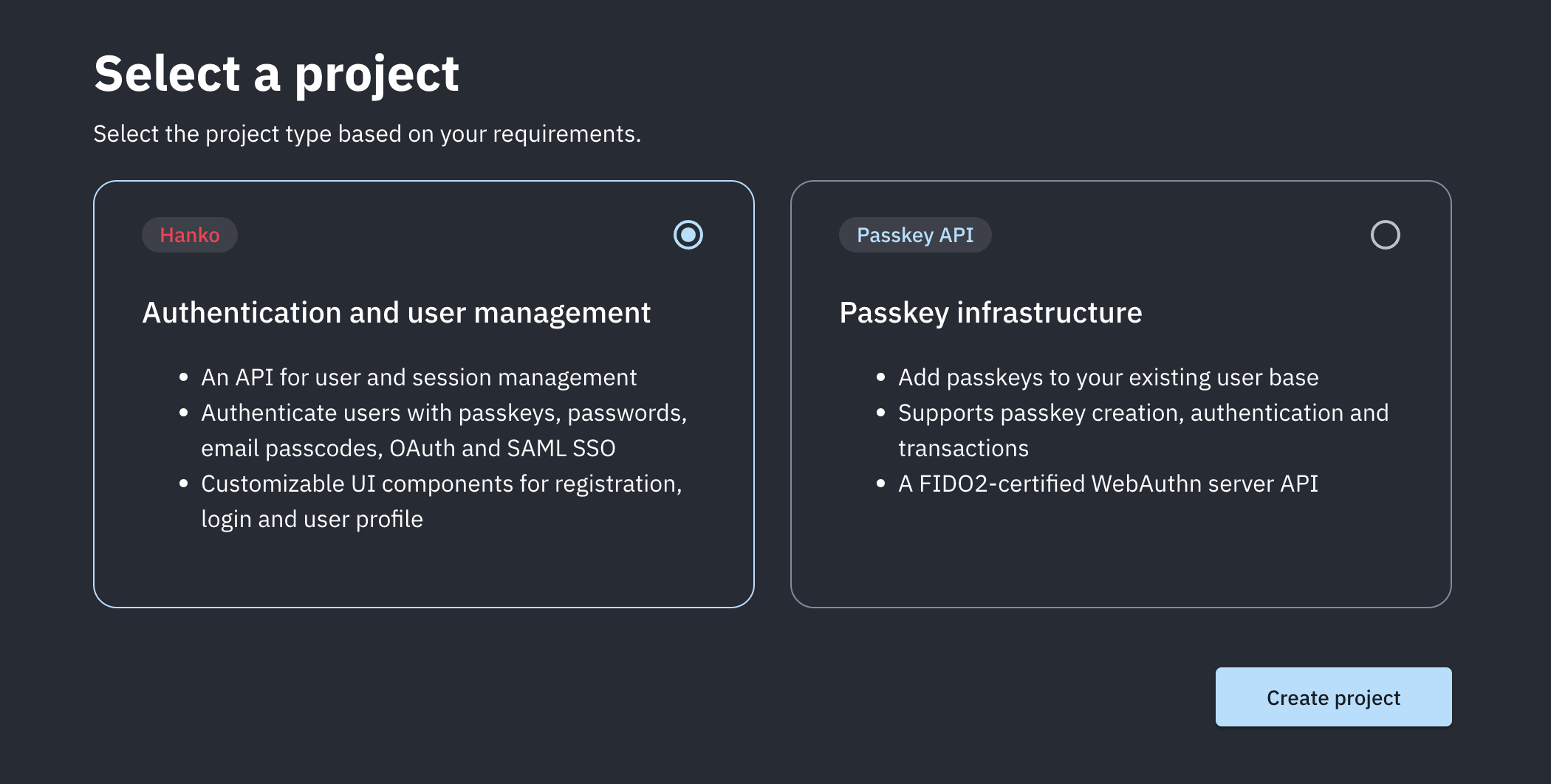 With your organization set, it’s time to kick off a new Hanko Cloud project. Choose ‘Authentication and user management’ and click on ‘Continue’. Of course you can also select ‘Passkey API’ if that’s what you want, but be aware that the remainder of this guide is specific for setting up Hanko projects.